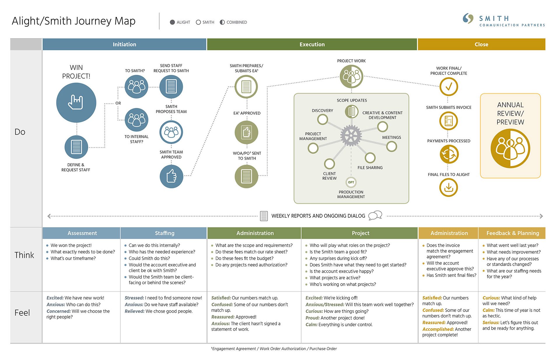 Developed for a long-term client relationship review, the map facilitated a discussion of the examination of the work process and production of deliverables. Concept | Design